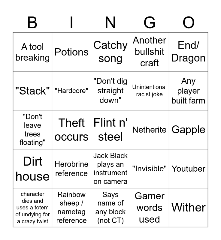 This bingo card has a free space and 24 words: Herobrine reference, Rainbow sheep / nametag reference, "Don't dig straight down", character dies and uses a totem of undying for a crazy twist, End/ Dragon, A tool breaking, "Stack", Potions, Netherite, Jack Black plays an instrument on camera, Unintentional racist joke, "Don't leave trees floating", "Invisible", Youtuber, "Hardcore", Gamer words used, Gapple, Catchy song, Any player built farm, Theft occurs, Wither, Dirt house, Another bullshit craft and Says name of any block (not CT).
