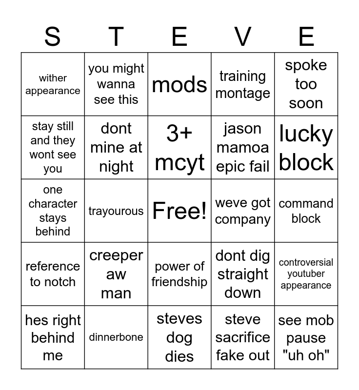 This bingo card has a free space and 24 words: hes right behind me, creeper aw man, 3+ mcyt, steve sacrifice fake out, spoke too soon, wither appearance, you might wanna see this, mods, weve got company, command block, one character stays behind, dont mine at night, dont dig straight down, controversial youtuber appearance, stay still and they wont see you, dinnerbone, steves dog dies, training montage, lucky block, reference to notch, trayourous, power of friendship, jason mamoa epic fail and see mob pause "uh oh".