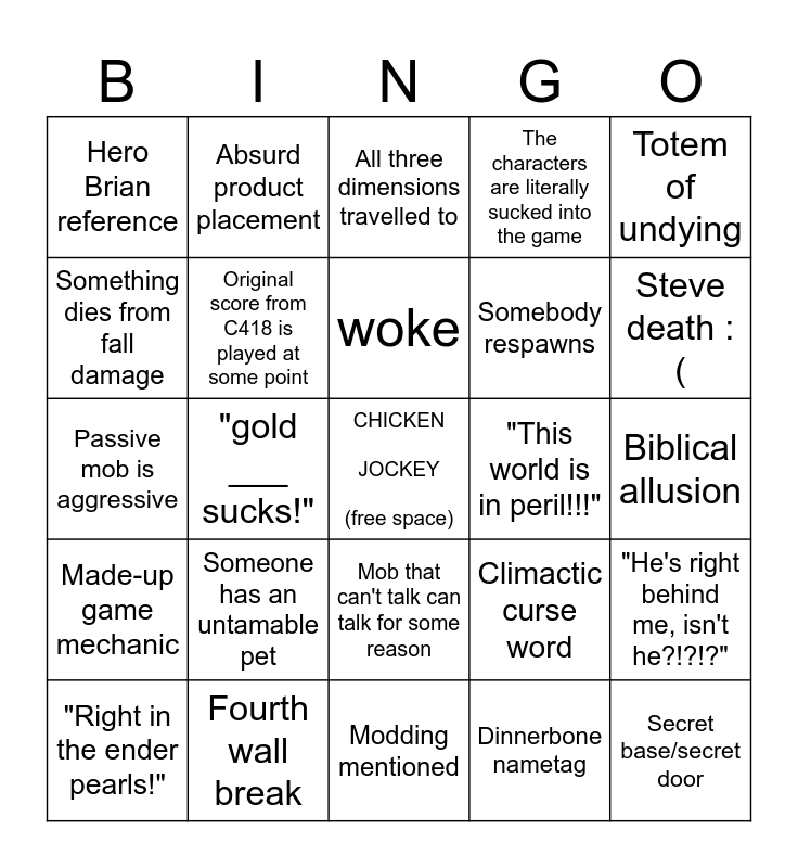This bingo card has a free space and 24 words: Someone has an untamable pet, Fourth wall break, woke, "Right in the ender pearls!", Totem of undying, Hero Brian reference, Something dies from fall damage, Absurd product placement, "This world is in peril!!!", Mob that can't talk can talk for some reason, Somebody respawns, Passive mob is aggressive, Climactic curse word, "He's right behind me, isn't he?!?!?", Original score from C418 is played at some point, Dinnerbone nametag, Biblical allusion, All three dimensions travelled to, Steve death :(, "gold ___ sucks!", Secret base/secret door, Made-up game mechanic, The characters are literally sucked into the game and Modding mentioned.