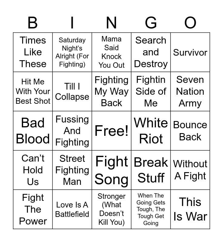 This bingo card has a free space and 33 words: Kung Fu Fighting, Eye Of The Tiger, Fussing And Fighting, Tubthumping, Can’t Hold Us, Till I Collapse, Survivor, Fight The Power, Saturday Night’s Alright (For Fighting), Battlefield, Fighting My Way Back, Mama Said Knock You Out, Kiss With A Fist, (You Gotta) Fight For Your Right (To Party), White Riot, Seven Nation Army, Love Is A Battlefield, Bad Blood, Street Fighting Man, Break Stuff, Fight Song, Never Say Never, Times Like These, Bounce Back, Stronger (What Doesn’t Kill You), This Is War, Search and Destroy, Fightin Side of Me, Hit Me With Your Best Shot, Without A Fight, Last One Standing, When The Going Gets Tough, The Tough Get Going and Fighter.