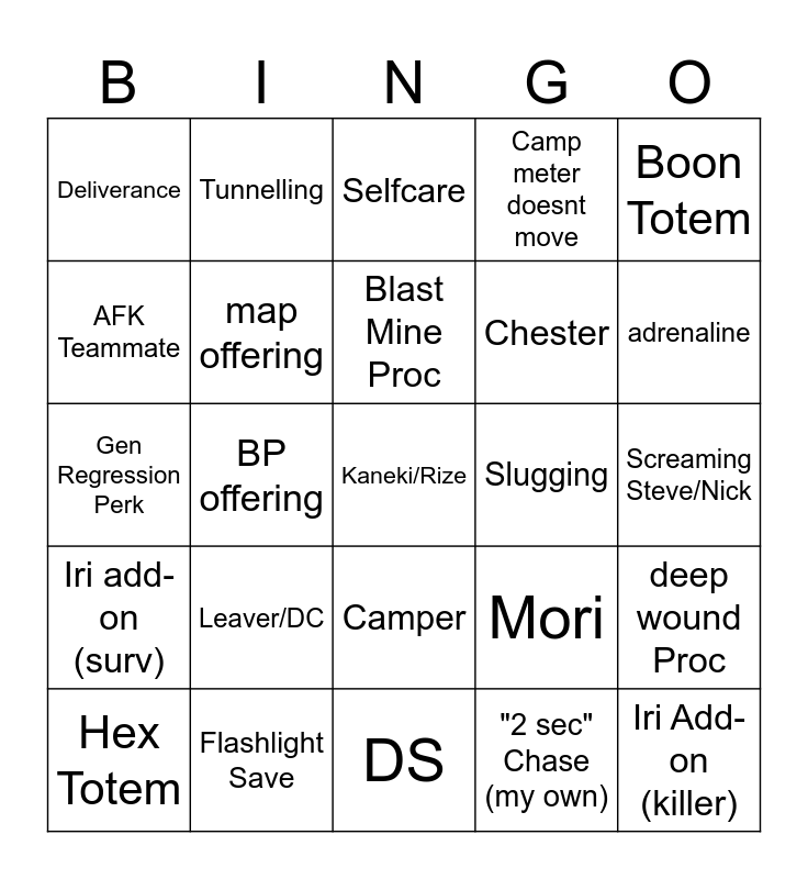 This bingo card has a free space and 24 words: Leaver/DC, Flashlight Save, Blast Mine Proc, Hex Totem, Boon Totem, Deliverance, AFK Teammate, Tunnelling, Slugging, Camper, Chester, Gen Regression Perk, Mori, deep wound Proc, map offering, "2 sec" Chase (my own), Screaming Steve/Nick, Selfcare, adrenaline, BP offering, Iri Add-on (killer), Iri add-on (surv), Camp meter doesnt move and DS.