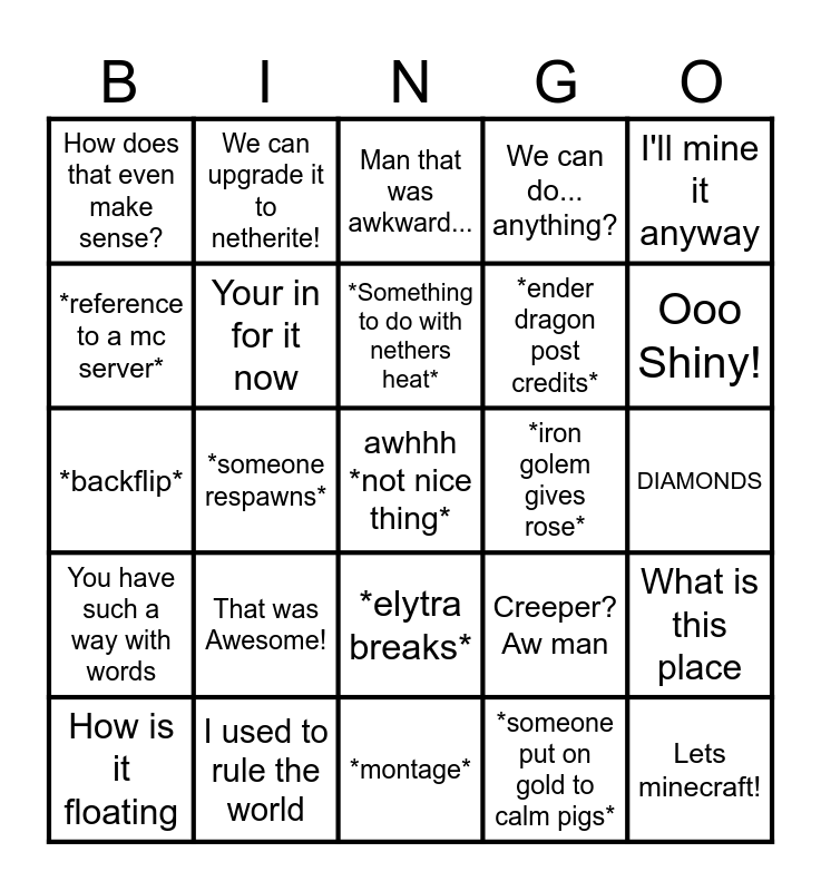 This bingo card has a free space and 24 words: That was Awesome!, I used to rule the world, *Something to do with nethers heat*, How is it floating, I'll mine it anyway, How does that even make sense?, *reference to a mc server*, We can upgrade it to netherite!, *iron golem gives rose*, *elytra breaks*, *ender dragon post credits*, *backflip*, Creeper? Aw man, What is this place, Your in for it now, *someone put on gold to calm pigs*, DIAMONDS, Man that was awkward..., Ooo Shiny!, *someone respawns*, Lets minecraft!, You have such a way with words, We can do... anything? and *montage*.