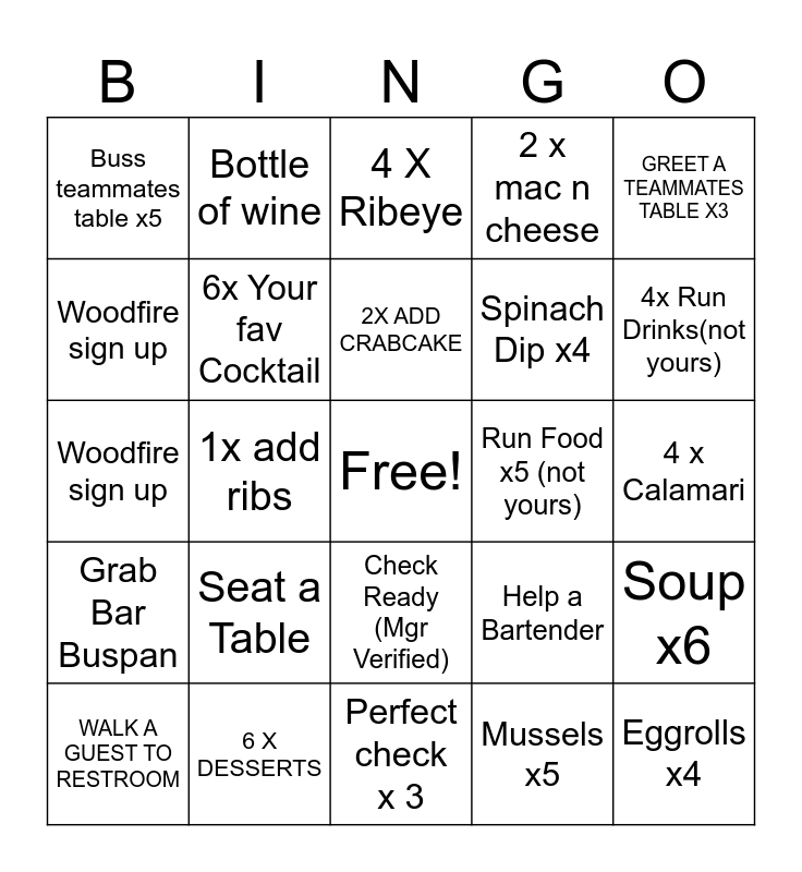 This bingo card has a free space and 24 words: Seat a Table, 6 X DESSERTS, 2X ADD CRABCAKE, WALK A GUEST TO RESTROOM, GREET A TEAMMATES TABLE X3, Buss teammates table x5, Woodfire sign up, Bottle of wine, Run Food x5 (not yours), Check Ready (Mgr Verified), Spinach Dip x4, Woodfire sign up, Help a Bartender, Soup x6, 6x Your fav Cocktail, Mussels x5, 4 x Calamari, 4 X Ribeye, 4x Run Drinks(not yours), 1x add ribs, Eggrolls x4, Grab Bar Buspan, 2 x mac n cheese and Perfect check x 3.