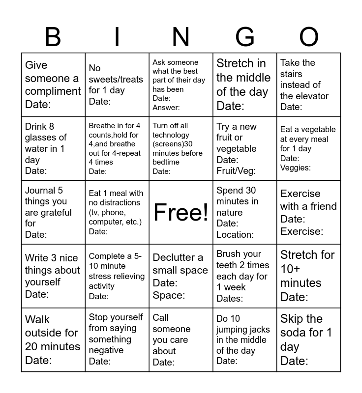 This bingo card has a free space and 24 words: Complete a 5-10 minute stress relieving activity Date:, Stop yourself from saying something negative Date:, Turn off all technology (screens)30 minutes before bedtime Date:, Walk outside for 20 minutes Date:, Take the stairs instead of the elevator Date:, Give someone a compliment Date:, Drink 8 glasses of water in 1 day Date:, No sweets/treats for 1 day Date:, Spend 30 minutes in nature Date: Location:, Declutter a small space Date: Space:, Try a new fruit or vegetable Date: Fruit/Veg:, Journal 5 things you are grateful for Date:, Brush your teeth 2 times each day for 1 week Dates:, Stretch for 10+ minutes Date:, Breathe in for 4 counts,hold for 4,and breathe out for 4-repeat 4 times Date:, Do 10 jumping jacks in the middle of the day Date:, Exercise with a friend Date: Exercise:, Ask someone what the best part of their day has been Date: Answer:, Eat a vegetable at every meal for 1 day Date: Veggies:, Eat 1 meal with no distractions (tv, phone, computer, etc.) Date:, Skip the soda for 1 day Date:, Write 3 nice things about yourself Date:, Stretch in the middle of the day Date: and Call someone you care about Date:.