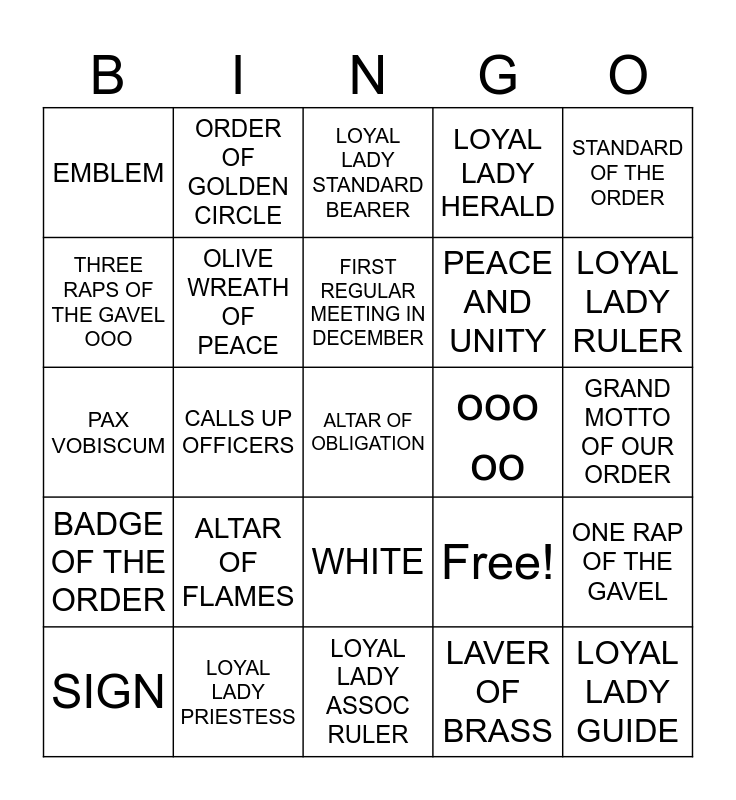 This bingo card has 25 words: ALTAR OF FLAMES, LOYAL LADY ASSOC RULER, FIRST REGULAR MEETING IN DECEMBER, SIGN, STANDARD OF THE ORDER, EMBLEM, THREE RAPS OF THE GAVEL OOO, ORDER OF GOLDEN CIRCLE, ooo oo, WHITE, PEACE AND UNITY, PAX VOBISCUM, Free!, ONE RAP OF THE GAVEL, OLIVE WREATH OF PEACE, LOYAL LADY GUIDE, GRAND MOTTO OF OUR ORDER, LOYAL LADY STANDARD BEARER, LOYAL LADY RULER, CALLS UP OFFICERS, ALTAR OF OBLIGATION, LOYAL LADY PRIESTESS, BADGE OF THE ORDER, LOYAL LADY HERALD and LAVER OF BRASS.