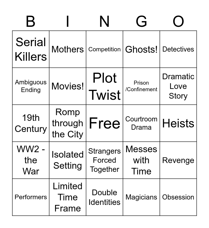 This bingo card has a free space and 24 words: Isolated Setting, Limited Time Frame, Plot Twist, Performers, Detectives, Serial Killers, Ambiguous Ending, Mothers, Courtroom Drama, Strangers Forced Together, Prison /Confinement, 19th Century, Messes with Time, Revenge, Movies!, Magicians, Heists, Competition, Dramatic Love Story, Romp through the City, Obsession, WW2 - the War, Ghosts! and Double Identities.