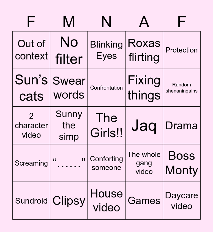 This bingo card has a free space and 29 words: Sundroid, Misgendering Roxas, Sunny the simp, Crossover, Out of context, Blinking Eyes, Swear words, “……”, Jaq, Clipsy, Drama, Daycare video, House video, Games, Random shenaningains, Caos, Conforting someone, Screaming, Protection, 2 character video, The whole gang video, No regrets, Fixing things, Sun’s cats, Roxas flirting, No filter, Boss Monty, Confrontation and “Men/Bro”.