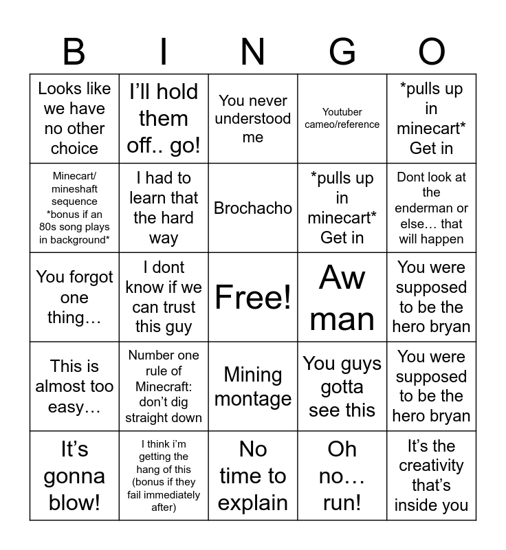 This bingo card has a free space and 28 words: You were supposed to be the hero bryan, You guys gotta see this, *pulls up in minecart* Get in, Oh no… run!, Minecart/ mineshaft sequence *bonus if an 80s song plays in background*, You never understood me, I’ll hold them off.. go!, This is almost too easy…, Aw man, It’s gonna blow!, You forgot one thing…, Youtuber cameo/reference, I think i’m getting the hang of this (bonus if they fail immediately after), No time to explain, Dont look at the enderman or else… that will happen, DJ got us falling in love (or minecraft parody), Number one rule of Minecraft: don’t dig straight down, I had to learn that the hard way, Brochacho, Mining montage, Looks like we have no other choice, I was always.. different, It’s the creativity that’s inside you, I dont know if we can trust this guy, You were supposed to be the hero bryan, You guys gotta see this, *pulls up in minecart* Get in and Oh no… run!.