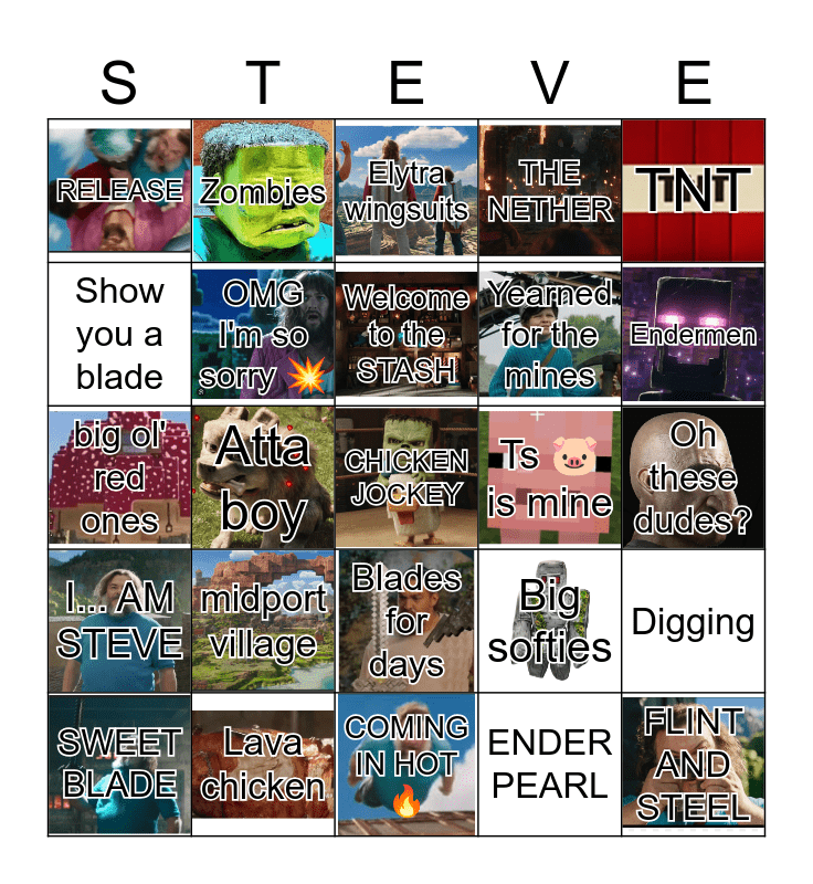 This bingo card has 28 images, a free space and 33 words: Wither and die, THIS... IS A CRAFTING TABLE, Atta boy, Buck chucket, I... AM STEVE, OMG I'm so sorry 💥, TNT, SWEET BLADE, Zombies, Protein like pronto, Welcome to the STASH, Elytra wingsuits, Shhh we're talking, Ninja roll, Ts 🐷 is mine, Endermen, Lava chicken, big ol' red ones, midport village, Big softies, Blades for days, Crushin loaf, RELEASE, Oh these dudes?, COMING IN HOT 🔥, FLINT AND STEEL, THE NETHER, Yearned for the mines, Show you a blade, Digging, Your head is HUGE, ENDER PEARL and Firework rockets.