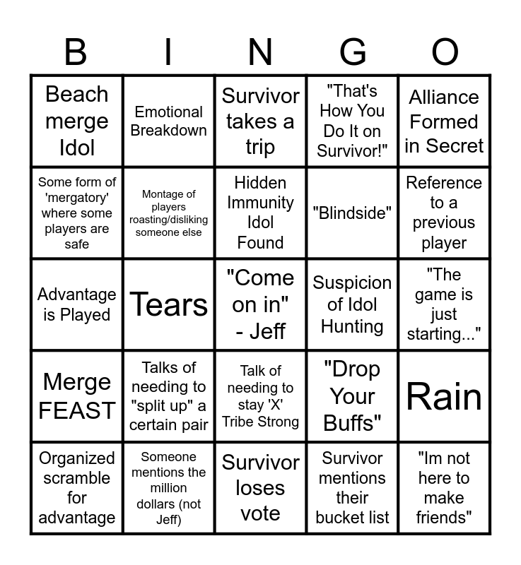 This bingo card has a free space and 24 words: Talks of needing to "split up" a certain pair, Someone mentions the million dollars (not Jeff), Hidden Immunity Idol Found, Organized scramble for advantage, Alliance Formed in Secret, Beach merge Idol, Some form of 'mergatory' where some players are safe, Emotional Breakdown, Suspicion of Idol Hunting, Talk of needing to stay 'X' Tribe Strong, "Blindside", Advantage is Played, "Drop Your Buffs", Rain, Montage of players roasting/disliking someone else, Survivor mentions their bucket list, "The game is just starting...", Survivor takes a trip, Reference to a previous player, Tears, "Im not here to make friends", Merge FEAST, "That's How You Do It on Survivor!" and Survivor loses vote.