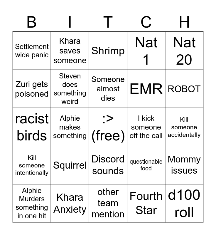 This bingo card has a free space and 24 words: Squirrel, Khara Anxiety, Someone almost dies, Alphie Murders something in one hit, Nat 20, Settlement wide panic, Zuri gets poisoned, Khara saves someone, I kick someone off the call, Discord sounds, EMR, racist birds, questionable food, Mommy issues, Steven does something weird, Fourth Star, Kill someone accidentally, Shrimp, ROBOT, Alphie makes something, d100 roll, Kill someone intentionally, Nat 1 and other team mention.