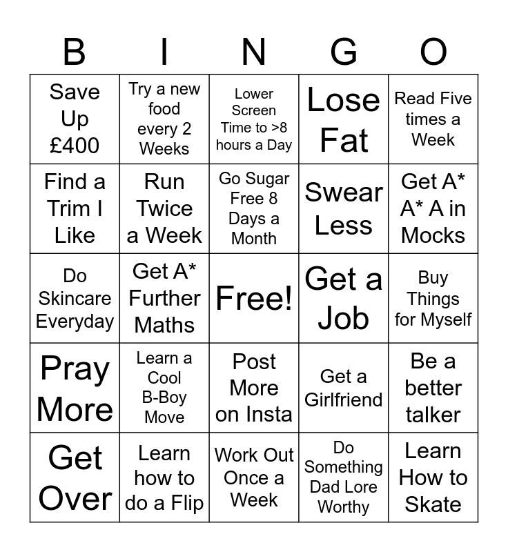 This bingo card has a free space and 24 words: Learn a Cool B-Boy Move, Learn how to do a Flip, Go Sugar Free 8 Days a Month, Get Over, Read Five times a Week, Save Up £400, Find a Trim I Like, Try a new food every 2 Weeks, Get a Job, Post More on Insta, Swear Less, Do Skincare Everyday, Get a Girlfriend, Be a better talker, Run Twice a Week, Do Something Dad Lore Worthy, Buy Things for Myself, Lower Screen Time to >8 hours a Day, Get A* A* A in Mocks, Get A* Further Maths, Learn How to Skate, Pray More, Lose Fat and Work Out Once a Week.