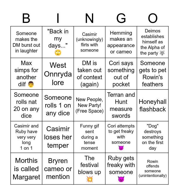 This bingo card has a free space and 24 words: Casimir loses her temper, Bryren cameo or mention, DM is taken out of context (again), Morthis is called Margaret, Deimos establishes himself as the Alpha of the party 🐺, Someone makes the DM burst out in laughter, Max simps for another dilf 👨, "Back in my days..." 🙄, Terran and Hunt measure swords, Funny gif sent during a tense moment, Cori says something out of pocket, Someone rolls nat 20 on any dice, Cori attempts to get freaky with someone 😈, "Dog" destroys something on the first day, West Onnryda lore, Ruby gets freaky with someone 😈, Honeyhall flashback, Casimir (unknowingly) flirts with someone, Someone gets to pet Rowin's feathers, Someone rolls 1 on any dice, Rowin offends someone (unintentionally), Casimir and Ruby have very very long 1 on 1, Hemming makes an appearance or cameo and The festival blows up 💥.