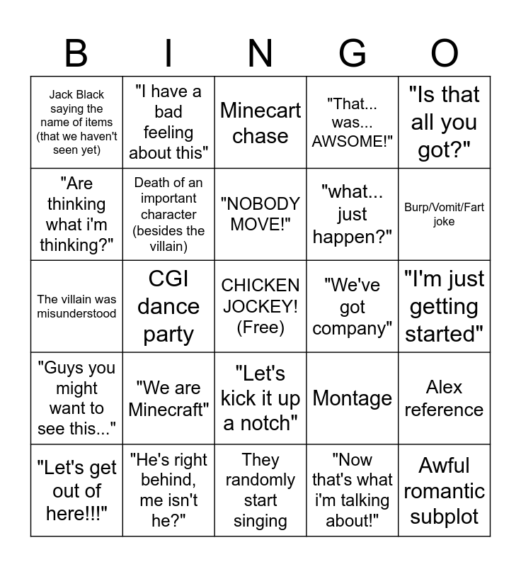 This bingo card has a free space and 24 words: "We are Minecraft", "He's right behind, me isn't he?", "NOBODY MOVE!", "Let's get out of here!!!", "Is that all you got?", Jack Black saying the name of items (that we haven't seen yet), "Are thinking what i'm thinking?", "I have a bad feeling about this", "We've got company", "Let's kick it up a notch", "what... just happen?", The villain was misunderstood, Montage, Alex reference, Death of an important character (besides the villain), "Now that's what i'm talking about!", "I'm just getting started", Minecart chase, Burp/Vomit/Fart joke, CGI dance party, Awful romantic subplot, "Guys you might want to see this...", "That... was... AWSOME!" and They randomly start singing.