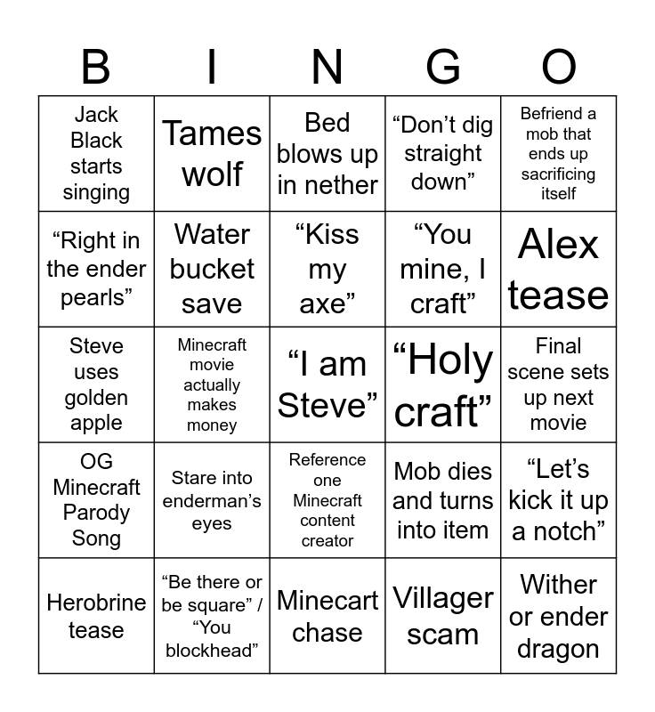 This bingo card has a free space and 24 words: Stare into enderman’s eyes, “Be there or be square” / “You blockhead”, “Kiss my axe”, Herobrine tease, Befriend a mob that ends up sacrificing itself, Jack Black starts singing, “Right in the ender pearls”, Tames wolf, “Holy craft”, Reference one Minecraft content creator, “You mine, I craft”, Steve uses golden apple, Mob dies and turns into item, “Let’s kick it up a notch”, Water bucket save, Villager scam, Final scene sets up next movie, Bed blows up in nether, Alex tease, Minecraft movie actually makes money, Wither or ender dragon, OG Minecraft Parody Song, “Don’t dig straight down” and Minecart chase.