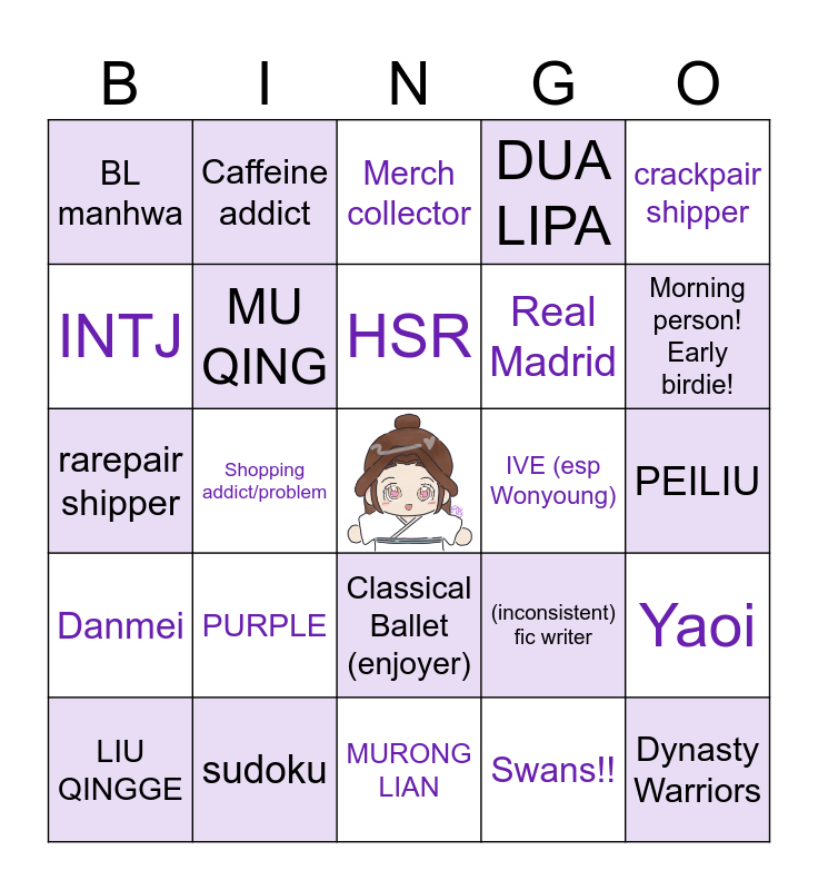 This bingo card has a free space and 24 words: PURPLE, sudoku, HSR, LIU QINGGE, crackpair shipper, BL manhwa, INTJ, Caffeine addict, IVE (esp Wonyoung), Classical Ballet (enjoyer), Real Madrid, rarepair shipper, (inconsistent) fic writer, Yaoi, MU QING, Swans!!, PEILIU, Merch collector, Morning person! Early birdie!, Shopping addict/problem, Dynasty Warriors, Danmei, DUA LIPA and MURONG LIAN.