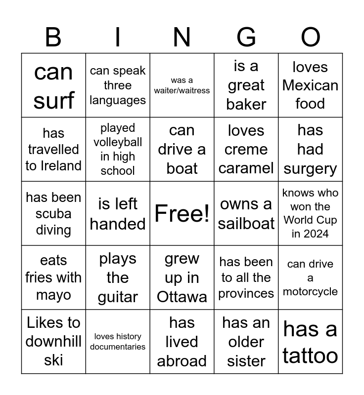 This bingo card has a free space and 29 words: Likes to downhill ski, does not like sushi, is left handed, has danced on a table, can surf, was a waiter/waitress, played volleyball in high school, plays the guitar, owns a sailboat, loves history documentaries, knows who won the World Cup in 2024, has a tattoo, has lived abroad, has an older sister, has had surgery, has drank milk fresh from the cow, grew up in Ottawa, eats fries with mayo, loves Mexican food, has been scuba diving, has been to all the provinces, is a civil servant, loves creme caramel, has travelled to Ireland, is a great baker, can speak three languages, can drive a motorcycle, can drive a boat and watches trash TV.