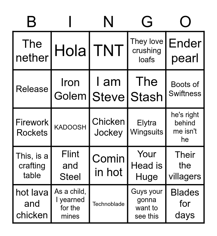 This bingo card has a free space and 24 words: Flint and Steel, As a child, I yearned for the mines, I am Steve, hot lava and chicken, Ender pearl, The nether, Release, Hola, Elytra Wingsuits, Comin in hot, The Stash, Firework Rockets, Your Head is Huge, Their the villagers, Iron Golem, Guys your gonna want to see this, he's right behind me isn't he, TNT, Boots of Swiftness, KADOOSH, Blades for days, This, is a crafting table, They love crushing loafs and Technoblade.