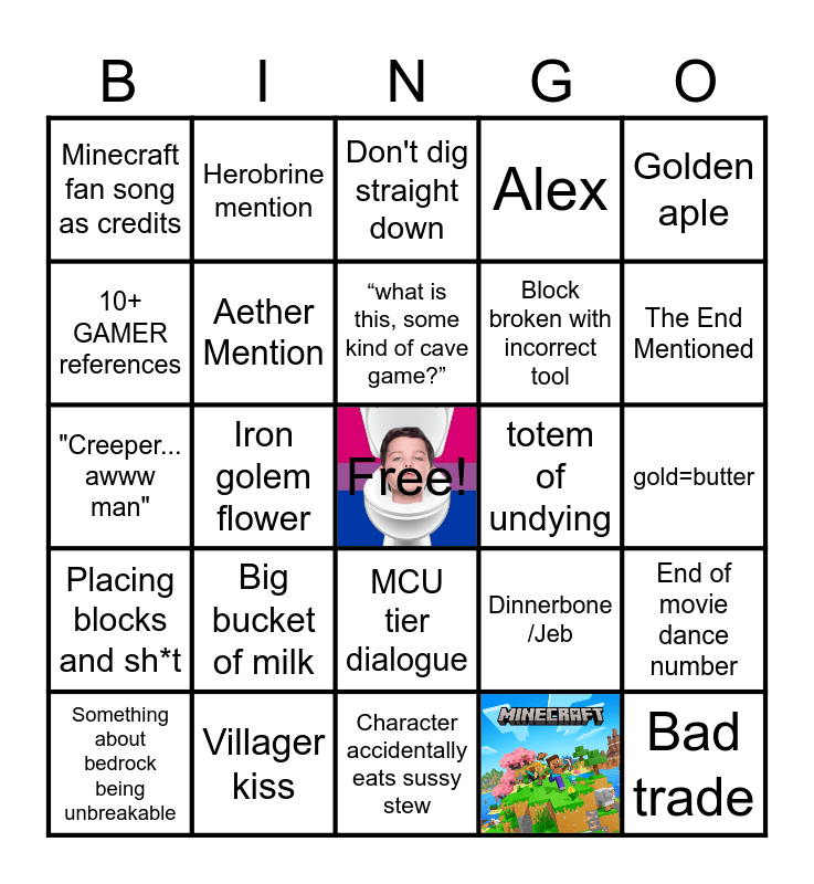 This bingo card has 1 images, a free space and 24 words: Big bucket of milk, Character accidentally eats sussy stew, “what is this, some kind of cave game?”, Something about bedrock being unbreakable, Golden aple, Minecraft fan song as credits, 10+ GAMER references, Herobrine mention, totem of undying, MCU tier dialogue, Block broken with incorrect tool, "Creeper... awww man", Dinnerbone /Jeb, End of movie dance number, Aether Mention, Story Mode reference, gold=butter, Don't dig straight down, The End Mentioned, Iron golem flower, Bad trade, Villager kiss, Placing blocks and sh*t and Alex.