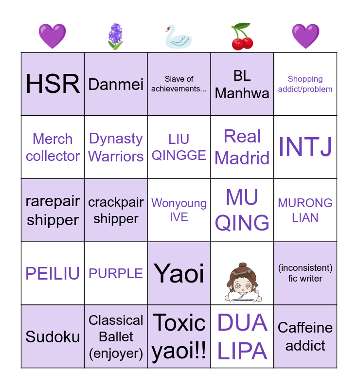 This bingo card has 1 images and 24 words: PURPLE, Toxic yaoi!!, LIU QINGGE, Sudoku, Shopping addict/problem, HSR, Merch collector, Danmei, MU QING, Yaoi, Real Madrid, rarepair shipper, (inconsistent) fic writer, Dynasty Warriors, Caffeine addict, MURONG LIAN, Slave of achievements..., INTJ, crackpair shipper, Wonyoung IVE, Classical Ballet (enjoyer), PEILIU, BL Manhwa and DUA LIPA.