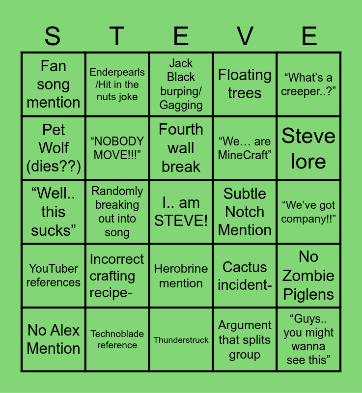 This bingo card has a free space and 24 words: Incorrect crafting recipe-, Technoblade reference, Fourth wall break, No Alex Mention, “What’s a creeper..?”, Fan song mention, Pet Wolf (dies??), Enderpearls /Hit in the nuts joke, Subtle Notch Mention, Herobrine mention, “We… are MineCraft”, “Well.. this sucks”, Cactus incident-, No Zombie Piglens, “NOBODY MOVE!!!”, Argument that splits group, “We’ve got company!!”, Jack Black burping/ Gagging, Steve lore, Randomly breaking out into song, “Guys.. you might wanna see this”, YouTuber references, Floating trees and Thunderstruck.
