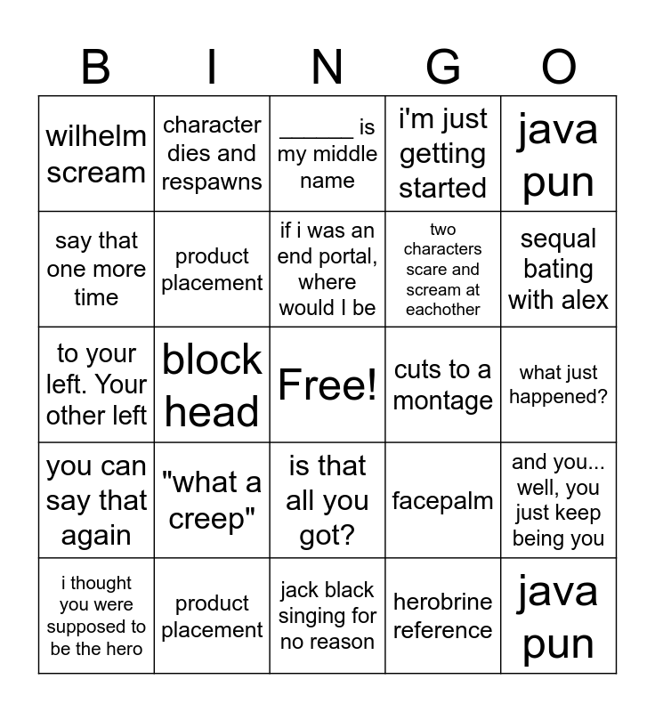This bingo card has a free space and 138 words: it's quiet... too quiet, let's get outta here!!!, he's right behind me, isn't he, that sounded better in my head, now that's what I'm talking about!, cuts to a montage, we can do this the easy way... or the hard way, aw man, let's kick it up a notch, is that all you got?, try me!, i'm just getting started, are you thinking what i'm thinking?, i have a bad feeling avout this..., we've got company!, we... are minecraft, what just happened?, right in the ender pearls!, it's gonna blow!!!, NOBODY MOVE!, thunderstruck plays, and you... well, you just keep being you, jack black singing for no reason, you better come take a look at this!, what are we gonna do now?, "what a creep", minecart chase, character dies and respawns, reference cut content, "wait! I can speak [mob]", java pun, wilhelm scream, two characters scare and scream at eachother, herobrine reference, "...bad dog! BAD DOG!", so let me get this straight, queerbaiting, burp/fart/vomit/bathroom joke, what is this place, CGI dance party, Can you put it in english for the rest of us?, awful romantic sub plot, joke about blocks having sharp edges, to your left. Your other left, facepalm, ______ is my middle name, this is the part where we start running, *gulp*, that... was... awesome!, someone dies and respawns, i'm not so sure about this, you can say that again, woah, is that tree floating?, not half bad, kid, i got it, i got it... i dont got it, if i was an end portal, where would I be, orchestral rendition of nostalgic minecraft songs, don't dig straight down, sequal bating with alex, dabbing/flossing/a fortnite dance, if you die here, you die irl, product placement, C418 music, crafting something that doesn't exist in game, youtuber cameo, stop... just stop, block head, i thought you were supposed to be the hero, say that one more time, ______ is my middle name, "...bad dog! BAD DOG!", "wait! I can speak [mob]", "what a creep", *gulp*, and you... well, you just keep being you, are you thinking what i'm thinking?, aw man, awful romantic sub plot, block head, burp/fart/vomit/bathroom joke, C418 music, Can you put it in english for the rest of us?, CGI dance party, character dies and respawns, crafting something that doesn't exist in game, cuts to a montage, dabbing/flossing/a fortnite dance, don't dig straight down, facepalm, he's right behind me, isn't he, herobrine reference, i got it, i got it... i dont got it, i have a bad feeling avout this..., i thought you were supposed to be the hero, i'm just getting started, i'm not so sure about this, if i was an end portal, where would I be, if you die here, you die irl, is that all you got?, it's gonna blow!!!, it's quiet... too quiet, jack black singing for no reason, java pun, joke about blocks having sharp edges, let's get outta here!!!, let's kick it up a notch, minecart chase, NOBODY MOVE!, not half bad, kid, now that's what I'm talking about!, orchestral rendition of nostalgic minecraft songs, product placement, queerbaiting, reference cut content, right in the ender pearls!, say that one more time, sequal bating with alex, so let me get this straight, someone dies and respawns, stop... just stop, that sounded better in my head, that... was... awesome!, this is the part where we start running, thunderstruck plays, to your left. Your other left, try me!, two characters scare and scream at eachother, we can do this the easy way... or the hard way, we... are minecraft, we've got company!, what are we gonna do now?, what is this place, what just happened?, wilhelm scream, woah, is that tree floating?, you better come take a look at this!, you can say that again and youtuber cameo.