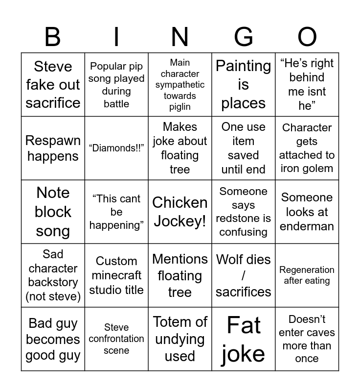 This bingo card has a free space and 39 words: Fortnite dance, Ender dragon mentioned, Dirt house is built, “Diamonds!!”, Bad guy becomes good guy, Mentions floating tree, Makes joke about floating tree, “Creepy…” to a creeper, “He’s right behind me isnt he”, Sad character backstory (not steve), “This cant be happening”, Painting is places, Doesn’t enter caves more than once, Someone looks at enderman, Someone says redstone is confusing, Custom minecraft studio title, Cameos are not themselves, Steve fake out sacrifice, Everyone (incl. steve) goes to real world, Wolf dies / sacrifices, Respawn happens, Totem of undying used, One use item saved until end, Character gets attached to iron golem, Zombie villager created, Villager made fun of hand together, Villager gets married, Villager forms sentences, Alex mentioned, Popular pip song played during battle, Villain enraged by creativity, Mamoa’s skills come in clutch, Main character sympathetic towards piglin, Steve confrontation scene, Fat joke, Music disc played, Regeneration after eating, Note block song and Milk is drank.