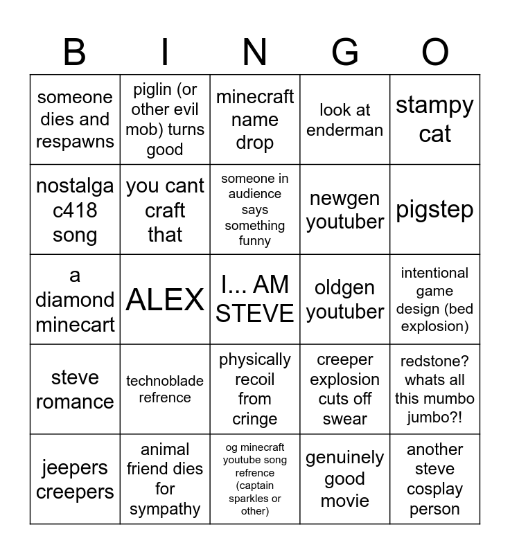 This bingo card has a free space and 24 words: technoblade refrence, animal friend dies for sympathy, someone in audience says something funny, jeepers creepers, stampy cat, someone dies and respawns, nostalga c418 song, piglin (or other evil mob) turns good, oldgen youtuber, physically recoil from cringe, newgen youtuber, a diamond minecart, creeper explosion cuts off swear, redstone? whats all this mumbo jumbo?!, you cant craft that, genuinely good movie, intentional game design (bed explosion), minecraft name drop, pigstep, ALEX, another steve cosplay person, steve romance, look at enderman and og minecraft youtube song refrence (captain sparkles or other).