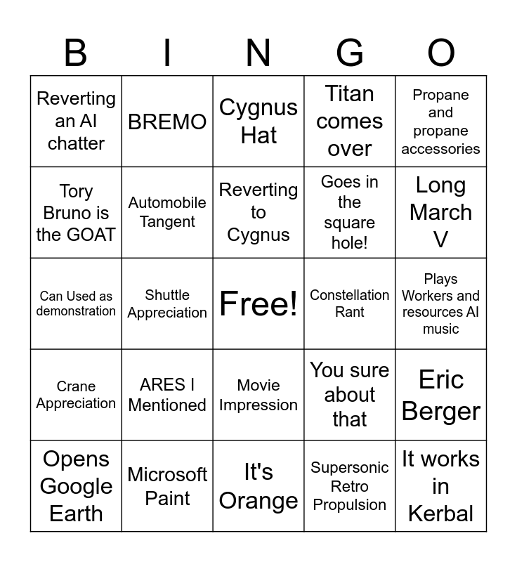 This bingo card has a free space and 24 words: ARES I Mentioned, Microsoft Paint, Reverting to Cygnus, Opens Google Earth, Propane and propane accessories, Reverting an AI chatter, Tory Bruno is the GOAT, BREMO, Constellation Rant, Movie Impression, Goes in the square hole!, Can Used as demonstration, You sure about that, Eric Berger, Automobile Tangent, Supersonic Retro Propulsion, Plays Workers and resources AI music, Cygnus Hat, Long March V, Shuttle Appreciation, It works in Kerbal, Crane Appreciation, Titan comes over and It's Orange.