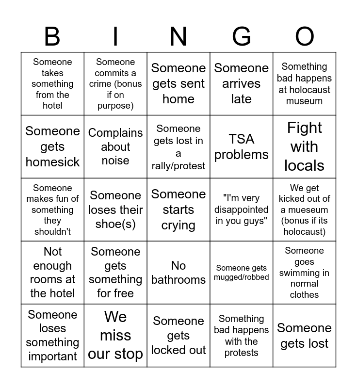 This bingo card has a free space and 44 words: Someone throws up, Someone gets lost, We get yelled at, Someone loses something important, The bus driver gets fed up with us, Something bad happens with the protests, Someone gets sent home, Someone has an allergic reaction to, Something bad happens at holocaust museum, We miss our stop, Someone arrives late, "I'm very disappointed in you guys", No bathrooms, Someone gets something for free, Someone explores hotel when they shouldn't be, Someone gets locked out, Roommate fight!, Someone makes fun of something they shouldn't, Airdrop gone wrong, Fight with locals, Someone commits a crime (bonus if on purpose), Someone's luggage doesn't show up, People sneak into other's rooms, Someone takes something from the hotel, Someone loses money/card, We get kicked out of a mueseum (bonus if its holocaust), Someone loses phone, Someone gets left behind, Someone gets mugged/robbed, Not enough rooms at the hotel, Someone gets pushed in the pool, Someone goes swimming in normal clothes, Witness a fight, rally, protest, Someone slips in mud, Someone loses their shoe(s), Someone's glasses break, HEAT STROKE, Sprained ankle, Someone gets lost in a rally/protest, Someone gets homesick, TSA problems, Get called racial slurs, Complains about noise and DEHYDRATION.