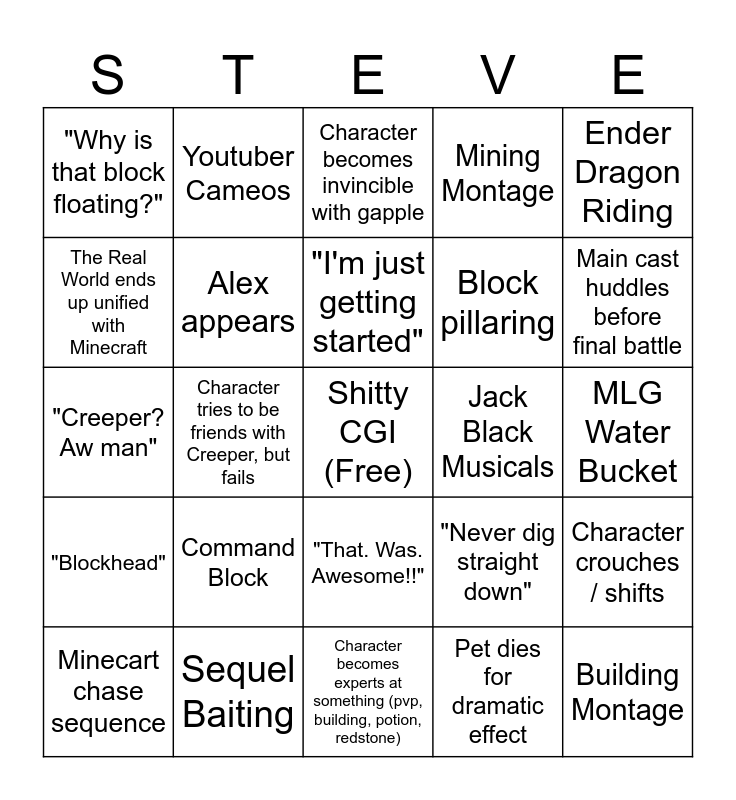 This bingo card has a free space and 24 words: Command Block, Sequel Baiting, "I'm just getting started", Minecart chase sequence, Ender Dragon Riding, "Why is that block floating?", The Real World ends up unified with Minecraft, Youtuber Cameos, Jack Black Musicals, "That. Was. Awesome!!", Block pillaring, "Creeper? Aw man", "Never dig straight down", Character crouches / shifts, Alex appears, Pet dies for dramatic effect, MLG Water Bucket, Character becomes invincible with gapple, Main cast huddles before final battle, Character tries to be friends with Creeper, but fails, Building Montage, "Blockhead", Mining Montage and Character becomes experts at something (pvp, building, potion, redstone).