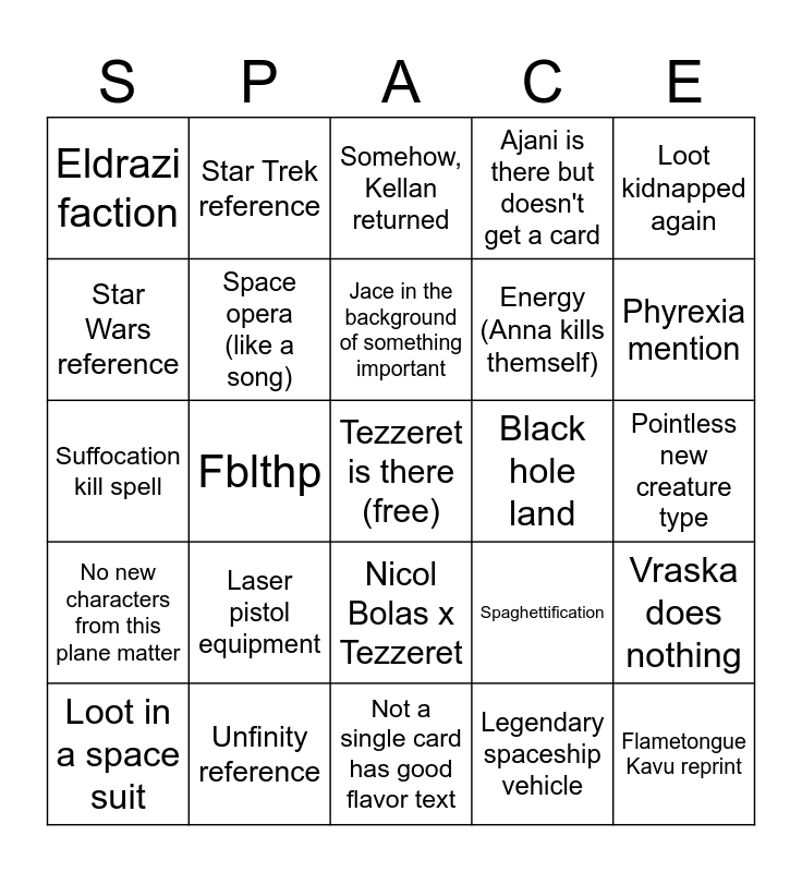 This bingo card has a free space and 24 words: Laser pistol equipment, Unfinity reference, Jace in the background of something important, Loot in a space suit, Loot kidnapped again, Eldrazi faction, Star Wars reference, Star Trek reference, Black hole land, Nicol Bolas x Tezzeret, Energy (Anna kills themself), Suffocation kill spell, Spaghettification, Vraska does nothing, Space opera (like a song), Legendary spaceship vehicle, Pointless new creature type, Somehow, Kellan returned, Phyrexia mention, Fblthp, Flametongue Kavu reprint, No new characters from this plane matter, Ajani is there but doesn't get a card and Not a single card has good flavor text.