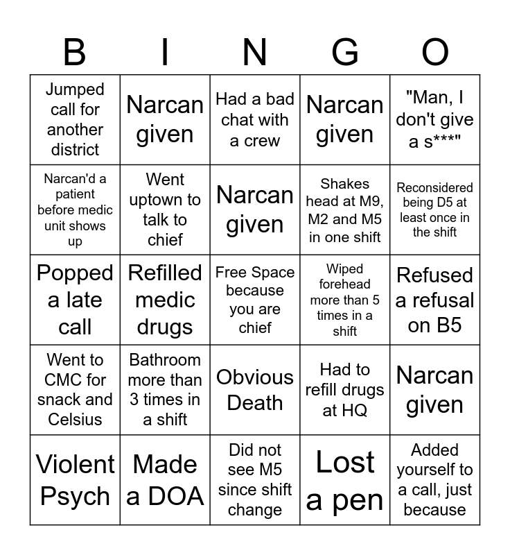 This bingo card has a free space and 29 words: Violent Psych, Saw M9 at least 2 times in a shift, Refilled medic drugs, Had employee fill out a 105, Jumped call for another district, Had a bad chat with a crew, Went uptown to talk to chief, Bathroom more than 3 times in a shift, Wiped forehead more than 5 times in a shift, Made a DOA, Refused a refusal on B5, Added yourself to a call, just because, Did not see M5 since shift change, Lost a pen, Reconsidered being D5 at least once in the shift, Extended the same medic unit 2 or more times in a shift, Obvious Death, Went to CMC for snack and Celsius, "Man, I don't give a s***", Popped a late call, Had to refill drugs at HQ, Dispatched to a call in Antioch, Shakes head at M9, M2 and M5 in one shift, Narcan'd a patient before medic unit shows up, Narcan given, Narcan given, Narcan given, Narcan given and Narcan given.