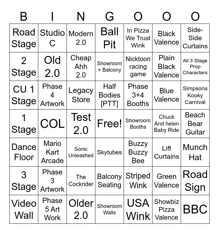 This bingo card has a free space and 48 words: Dance Floor, COL, Older 2.0, Skytubes, Nicktoon racing game, Chuck And helen Baby Ride, Side-Side Curtains, Video Wall, Phase 4 Artwork, Test 2.0, Ball Pit, In Pizza We Trust Wink, Blue Valence, Simpsons Kooky Carnival, 1 Stage, Phase 3 Artwork, Modern 2.0, Half Bodies [PTT], Striped Wink, Black Valence, All 3 Stage Prop Characters, 2 Stage, Studio C, Cheap Ahh 2.0, USA Wink, Plain Black Valence, Beach Bear Guitar, 3 Stage, Mario Kart Arcade, Legacy Store, Balcony Seating, Phase 3+4 Booths, Green Valence, Road Sign, Road Stage, Phase 5 Art Work, Sonic Unleashed, Showroom Walls, Showroom Booths, Showbiz Pizza Valence, Munch Hat, CU 1 Stage, Old 2.0, The Cockrider, Showroom + Balcony, Buzzy Buzzy Bee, Lift Curtains and BBC.