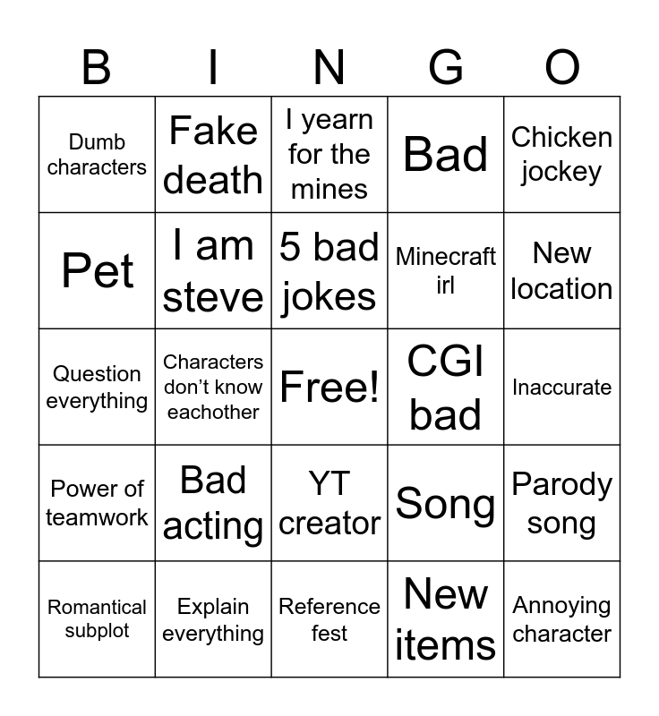 This bingo card has a free space and 24 words: Bad acting, Explain everything, 5 bad jokes, Romantical subplot, Chicken jockey, Dumb characters, Pet, Fake death, CGI bad, YT creator, Minecraft irl, Question everything, Song, Parody song, I am steve, New items, Inaccurate, I yearn for the mines, New location, Characters don’t know eachother, Annoying character, Power of teamwork, Bad and Reference fest.