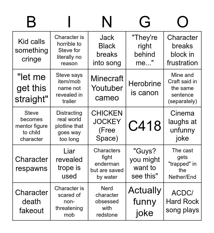 This bingo card has a free space and 32 words: Actually funny joke, Command block, Distracting real world plotline that goes way too long, Gen Alpha slang is used unironically, Character respawns, Steve says item/mob name not revealed in trailer, Character breaks block in frustration, The cast gets "trapped" in the Nether/End, Character is horrible to Steve for literally no reason, Someone breaks diamond with a stone or lower pickaxe, Minecraft Youtuber cameo, Jack Black breaks into song, Mob dies and drops loot comedically, Warden, C418, Character complains that minecraft breaks the laws of physics, Character death fakeout, Steve becomes mentor figure to child character, Characters fight enderman but are saved by water, Liar revealed trope is used, "Guys? you might want to see this", Character is really good with a bow for no reason, Cinema laughs at unfunny joke, Character is scared of non-threatening mob, ACDC/ Hard Rock song plays, "They're right behind me...", Herobrine is canon, "let me get this straight", Kid calls something cringe, Nerd character obsessed with redstone, Don't dig down and Mine and Craft said in the same sentence (separately).