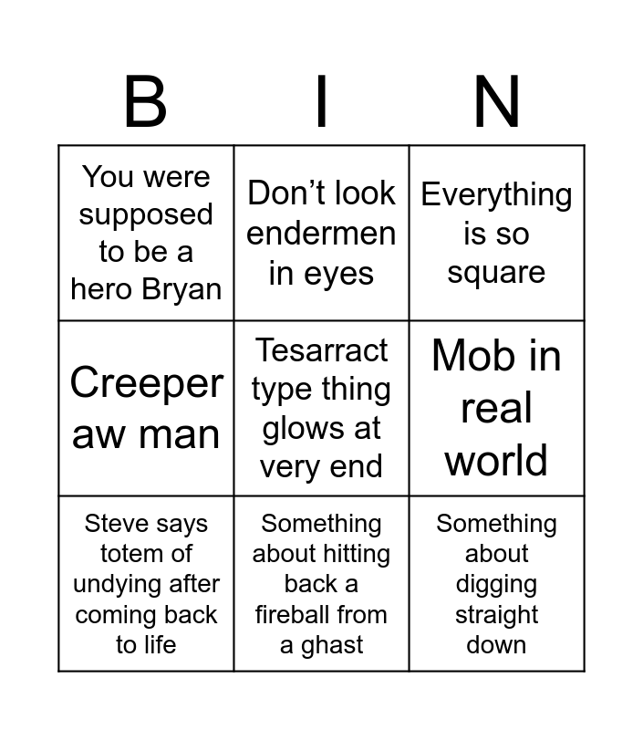 This bingo card has a free space and 8 words: Mob in real world, Everything is so square, Don’t look endermen in eyes, Steve says totem of undying after coming back to life, You were supposed to be a hero Bryan, Something about digging straight down, Creeper aw man and Something about hitting back a fireball from a ghast.