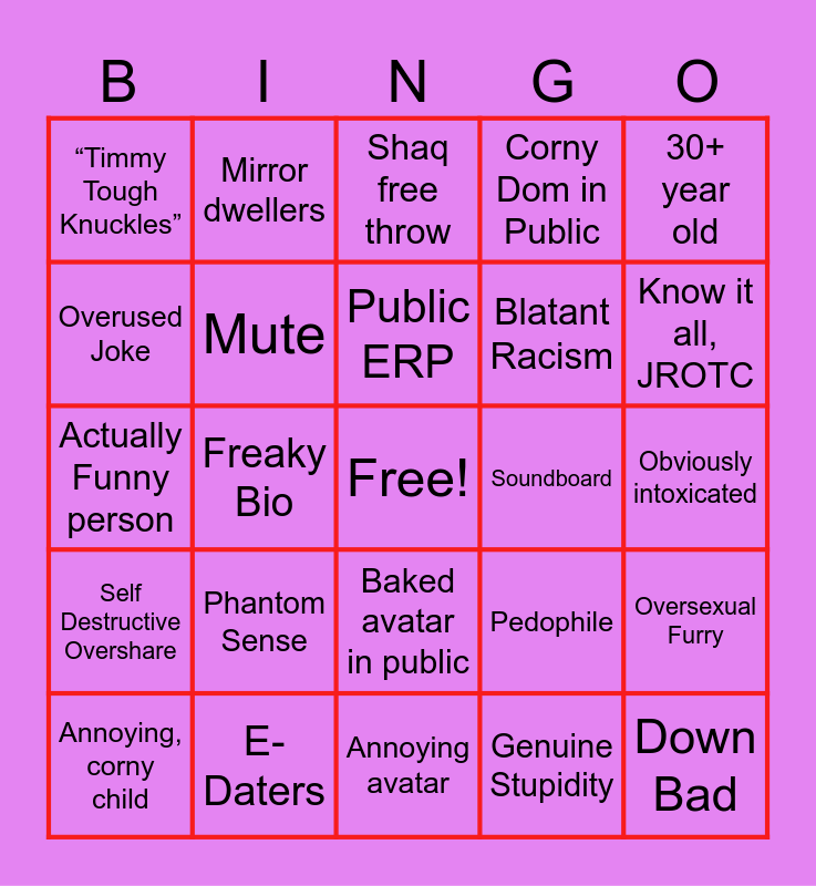 This bingo card has a free space and 24 words: Phantom Sense, E-Daters, Public ERP, Annoying, corny child, 30+ year old, “Timmy Tough Knuckles”, Overused Joke, Mirror dwellers, Soundboard, Baked avatar in public, Blatant Racism, Actually Funny person, Pedophile, Oversexual Furry, Mute, Genuine Stupidity, Obviously intoxicated, Shaq free throw, Know it all, JROTC, Freaky Bio, Down Bad, Self Destructive Overshare, Corny Dom in Public and Annoying avatar.