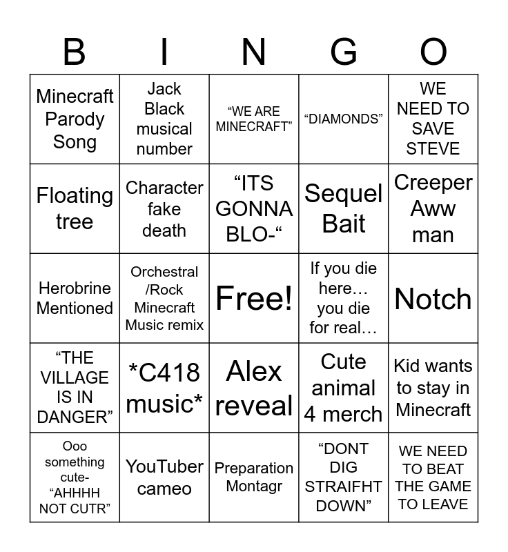 This bingo card has a free space and 24 words: *C418 music*, YouTuber cameo, “ITS GONNA BLO-“, Ooo something cute- “AHHHH NOT CUTR”, WE NEED TO SAVE STEVE, Minecraft Parody Song, Floating tree, Jack Black musical number, If you die here… you die for real…, Alex reveal, Sequel Bait, Herobrine Mentioned, Cute animal 4 merch, Kid wants to stay in Minecraft, Character fake death, “DONT DIG STRAIFHT DOWN”, Notch, “WE ARE MINECRAFT”, Creeper Aww man, Orchestral /Rock Minecraft Music remix, WE NEED TO BEAT THE GAME TO LEAVE, “THE VILLAGE IS IN DANGER”, “DIAMONDS” and Preparation Montagr.