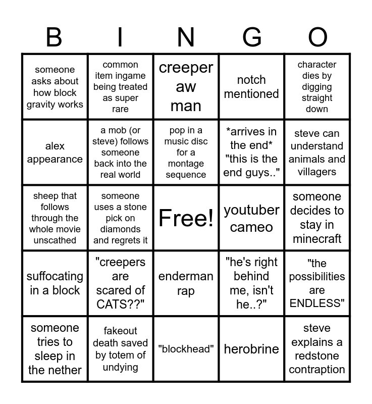 This bingo card has a free space and 24 words: "creepers are scared of CATS??", fakeout death saved by totem of undying, pop in a music disc for a montage sequence, someone tries to sleep in the nether, character dies by digging straight down, someone asks about how block gravity works, alex appearance, common item ingame being treated as super rare, youtuber cameo, enderman rap, *arrives in the end* "this is the end guys..", sheep that follows through the whole movie unscathed, "he's right behind me, isn't he..?", "the possibilities are ENDLESS", a mob (or steve) follows someone back into the real world, herobrine, someone decides to stay in minecraft, creeper aw man, steve can understand animals and villagers, someone uses a stone pick on diamonds and regrets it, steve explains a redstone contraption, suffocating in a block, notch mentioned and "blockhead".