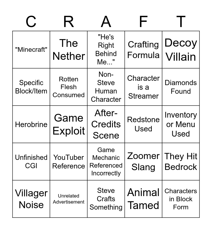 This bingo card has 25 words: YouTuber Reference, Steve Crafts Something, Non-Steve Human Character, Villager Noise, Decoy Villain, "Minecraft", Specific Block/Item, The Nether, Redstone Used, Game Mechanic Referenced Incorrectly, Character is a Streamer, Herobrine, Zoomer Slang, They Hit Bedrock, Rotten Flesh Consumed, Characters in Block Form, Inventory or Menu Used, "He's Right Behind Me...", Diamonds Found, Game Exploit, After-Credits Scene, Unrelated Advertisement, Unfinished CGI, Crafting Formula and Animal Tamed.