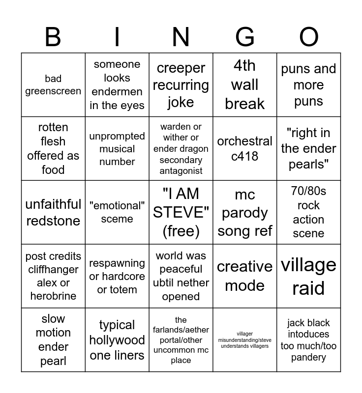 This bingo card has a free space and 24 words: respawning or hardcore or totem, typical hollywood one liners, warden or wither or ender dragon secondary antagonist, slow motion ender pearl, puns and more puns, bad greenscreen, rotten flesh offered as food, someone looks endermen in the eyes, mc parody song ref, world was peaceful ubtil nether opened, orchestral c418, unfaithful redstone, creative mode, village raid, unprompted musical number, villager misunderstanding/steve understands villagers, 70/80s rock action scene, creeper recurring joke, "right in the ender pearls", "emotional" sceme, jack black intoduces too much/too pandery, post credits cliffhanger alex or herobrine, 4th wall break and the farlands/aether portal/other uncommon mc place.