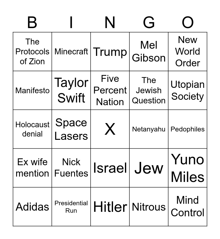 This bingo card has 25 words: Nick Fuentes, Hitler, Five Percent Nation, Adidas, New World Order, The Protocols of Zion, Manifesto, Minecraft, Netanyahu, Israel, The Jewish Question, Holocaust denial, Jew, Yuno Miles, Taylor Swift, Mind Control, Pedophiles, Trump, Utopian Society, Space Lasers, X, Presidential Run, Ex wife mention, Mel Gibson and Nitrous.