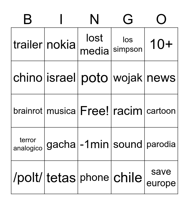 This bingo card has a free space and 24 words: gacha, tetas, poto, /polt/, 10+, trailer, chino, nokia, racim, -1min, wojak, brainrot, sound, parodia, israel, chile, cartoon, lost media, news, musica, save europe, terror analogico, los simpson and phone.