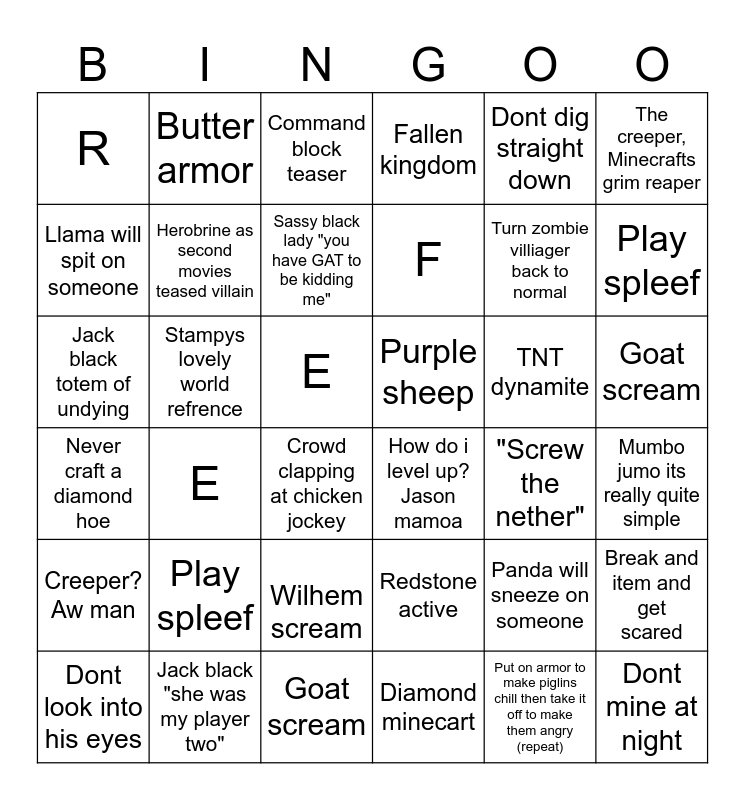 This bingo card has 36 words: Redstone active, Wilhem scream, Diamond minecart, Llama will spit on someone, Never craft a diamond hoe, Purple sheep, Herobrine as second movies teased villain, Goat scream, Dont dig straight down, Panda will sneeze on someone, Play spleef, Fallen kingdom, Break and item and get scared, Stampys lovely world refrence, F, R, Creeper? Aw man, TNT dynamite, Jack black totem of undying, Command block teaser, E, E, How do i level up? Jason mamoa, Crowd clapping at chicken jockey, "Screw the nether", Butter armor, Turn zombie villiager back to normal, Jack black "she was my player two", Sassy black lady "you have GAT to be kidding me", The creeper, Minecrafts grim reaper, Dont mine at night, Dont look into his eyes, Mumbo jumo its really quite simple, Goat scream, Play spleef and Put on armor to make piglins chill then take it off to make them angry (repeat).