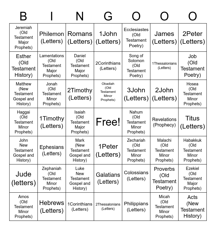 This bingo card has a free space and 48 words: Colossians (Letters), 1Thessalonians (Letters), 2Thessalonians (Letters), 1Timothy (Letters), 2Timothy (Letters), Titus (Letters), Philemon (Letters), Hebrews (Letters), James (Letters), 1Peter (Letters), 2Peter (Letters), 1John (Letters), 2John (Letters), 3John (Letters), Jude (letters), Revelations (Prophecy), Esther (Old Testament History), Job (Old Testament Poetry), Proverbs (Old Testament Poetry), Ecclesiastes (Old Testament Poetry), Song of Solomon (Old Testament Poetry), Isaiah (Old Testament Major Prophets), Jeremiah (Old Testament Major Prophets), Lamentations (Old Testament Major Prophets), Ezekiel (Old Testament Major Prophets), Daniel (Old Testament Major Prophets), Hosea (Old Testament Minor Prophets), Amos (Old Testament Minor Prophets), Obadiah (Old Testament Minor Prophets), Jonah (Old Testament Minor Prophets), Micah (Old Testament Minor Prophets), Nahum (Old Testament Minor Prophets), Habakkuk (Old Testament Minor Prophets), Zephaniah (Old Testament Minor Prophets), Haggai (Old Testament Minor Prophets), Zechariah (Old Testament Minor Prophets), Malachi (Old Testament Minor Prophets), Matthew (New Testament Gospel and History), Mark (New Testament Gospel and History), Luke New Testament Gospel and History), John New Testament Gospel and History), Acts (New Testament History), Romans (Letters), 1Corinthians (Letters), 2Corinthians (Letters), Galatians (Letters), Ephesians (Letters) and Philippians (Letters).