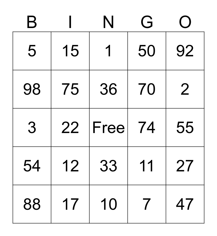 This bingo card has a free space and 24 words: 12, 17, 36, 88, 92, 5, 98, 15, 74, 33, 70, 3, 11, 27, 75, 7, 55, 1, 2, 22, 47, 54, 50 and 10.