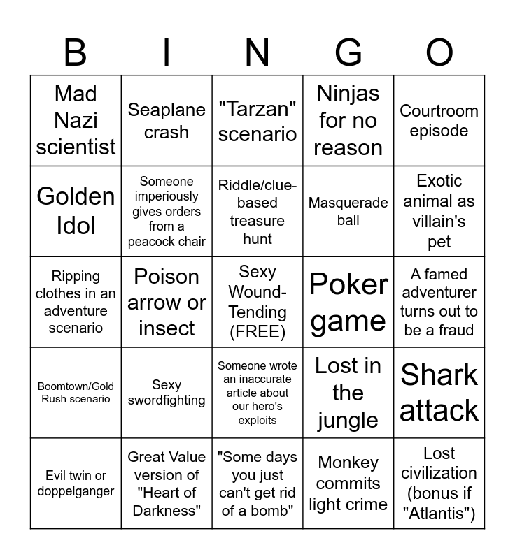 This bingo card has a free space and 24 words: Sexy swordfighting, Great Value version of "Heart of Darkness", Riddle/clue-based treasure hunt, Evil twin or doppelganger, Courtroom episode, Mad Nazi scientist, Golden Idol, Seaplane crash, Poker game, Someone wrote an inaccurate article about our hero's exploits, Masquerade ball, Ripping clothes in an adventure scenario, Lost in the jungle, Shark attack, Someone imperiously gives orders from a peacock chair, Monkey commits light crime, A famed adventurer turns out to be a fraud, "Tarzan" scenario, Exotic animal as villain's pet, Poison arrow or insect, Lost civilization (bonus if "Atlantis"), Boomtown/Gold Rush scenario, Ninjas for no reason and "Some days you just can't get rid of a bomb".