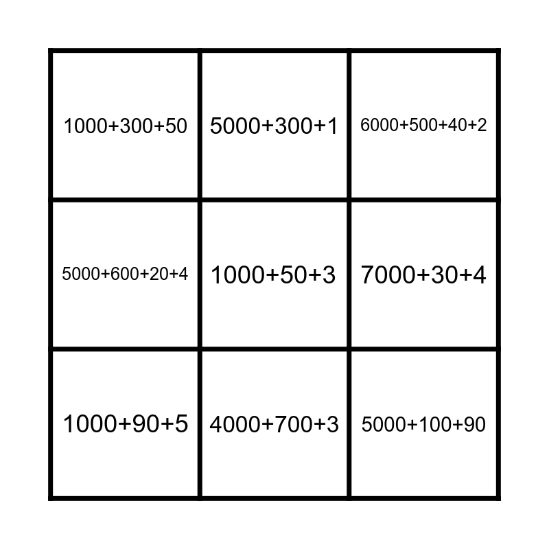 This bingo card has a free space and 17 words: 7000+300+40, 5000+100+9, 6000+500+40+2, 1000+300+50, 1000+300+5, 5000+600+20+4, 2000+400+60+5, 1000+90+5, 4000+700+3, 7000+30+4, 7000+300+4, 5000+900+10, 5000+100+90, 5000+300+1, 6000+500+4, 6000+40+5 and 6000+50+4.