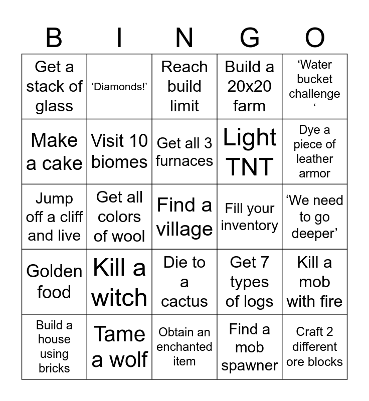 This bingo card has a free space and 24 words: Kill a witch, Tame a wolf, Get all 3 furnaces, Build a house using bricks, ‘Water bucket challenge ‘, Get a stack of glass, Make a cake, ‘Diamonds!’, Fill your inventory, Die to a cactus, Light TNT, Jump off a cliff and live, Get 7 types of logs, Kill a mob with fire, Visit 10 biomes, Find a mob spawner, ‘We need to go deeper’, Reach build limit, Dye a piece of leather armor, Get all colors of wool, Craft 2 different ore blocks, Golden food, Build a 20x20 farm and Obtain an enchanted item.